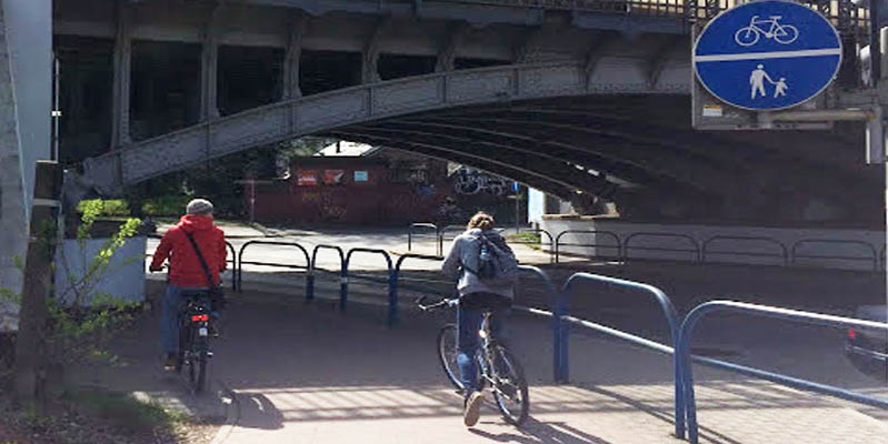Если велодорожка пересекается с тротуаром, то велосипедист уступает дорогу пешеходу. Если автомобильная дорога на повороте пересекает велосипедную, то приоритет у велосипеда.